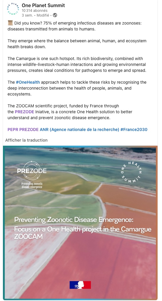 đ„ La ZACAM est ainsi mise en avant dans une vidĂ©o produite par le gouvernement français, et un carroussel rĂ©alisĂ© par l‘initiative PREZODE, qui valorisent le territoire camarguais comme site dâĂ©tude emblĂ©matique pour les enjeux One Health.